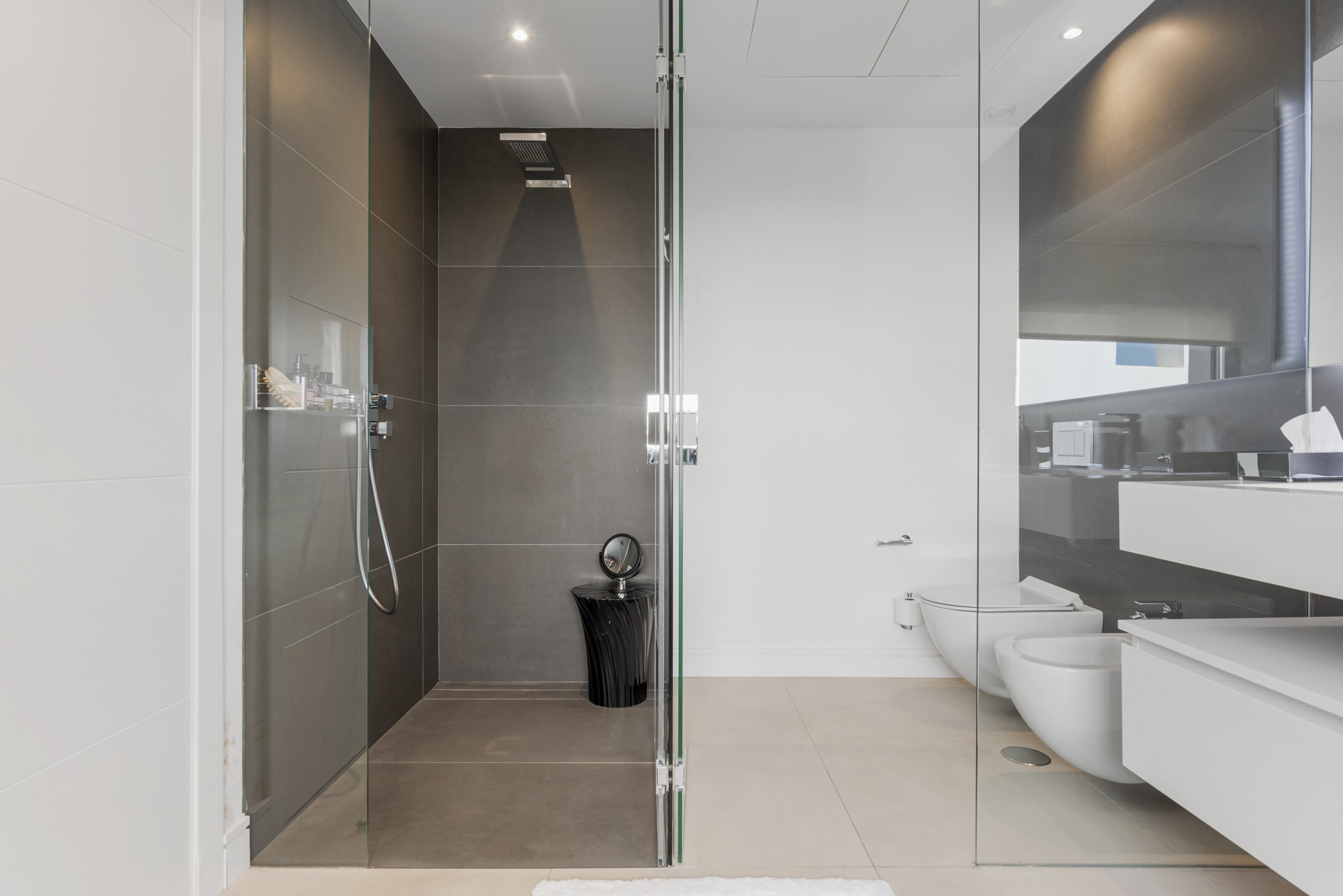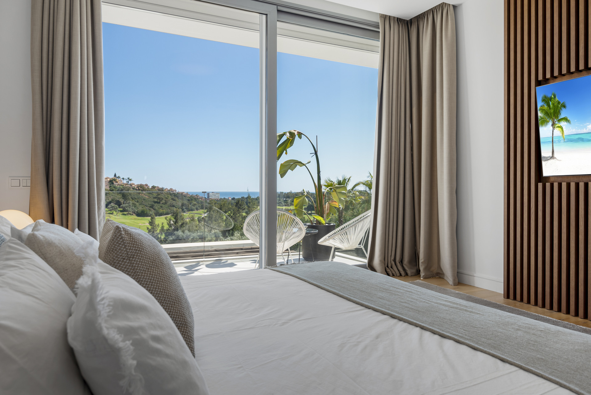 On the 1st floor are 3 bedrooms all with large balcony and 2 bathrooms. The master bedroom has an en-suite bathroom with shower and bath. From every room you have a beautiful view of the golf course and sea. 2 double bedrooms with a shared bathroom plus the master bedroom with en-suite bathroom with shower and bath.