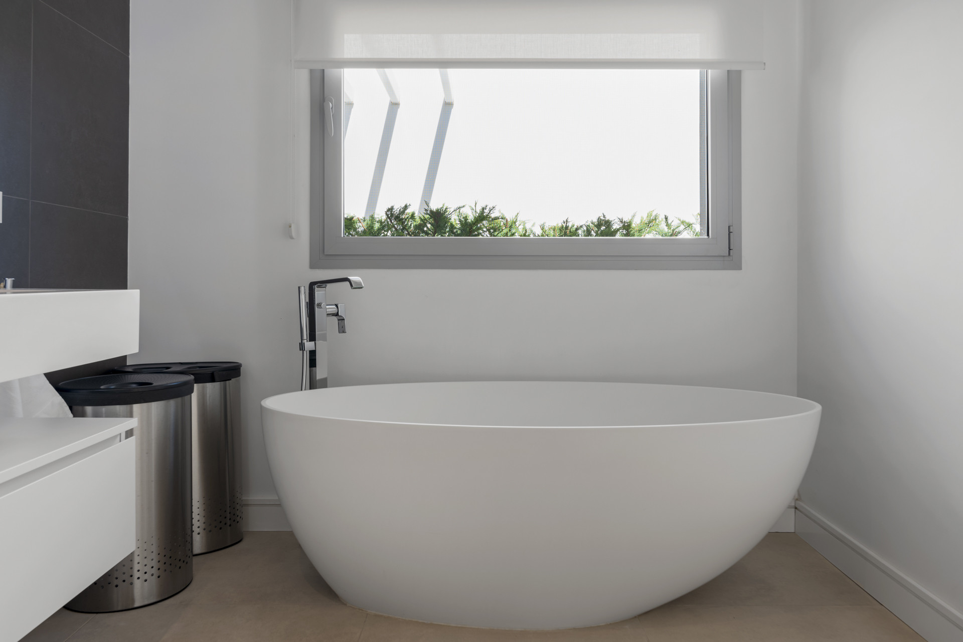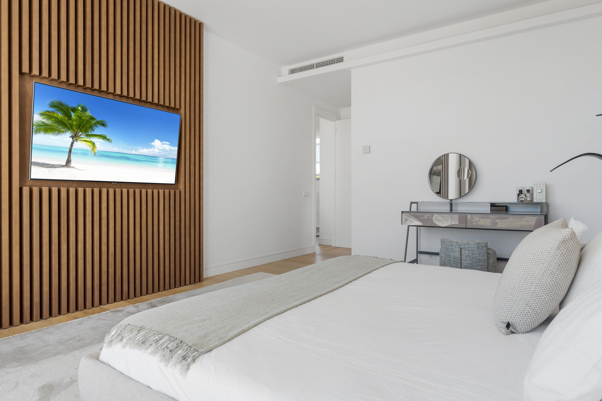 On the first floor, you’ll find three more bedrooms, each with a large balcony and breathtaking views. The master bedroom includes an en-suite bathroom with a shower and bath, while the other two double bedrooms share a bathroom.
